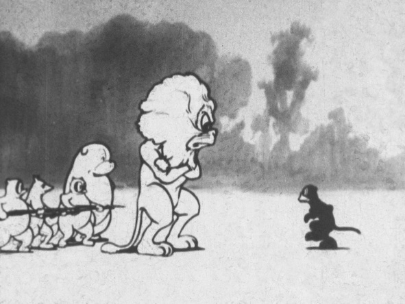 - ある森に怠け者の豚平と、正直で働き者の猿吉が住んでいた。豚平は仕事もせず猿吉をだましたり、猿吉の子供をいじめたりした。ある日、 おこった猿吉に手痛い目にあったのを根に持ち、森のライオン大王をおだてて、猿吉に戦闘をしかけて来た。猿吉は苦戦。ついに退却する。最後の鉄条網も破られ、追いつめられた猿吉。みるにみかねたモグラは、塹壕を掘り、敵の大軍を防ぐ一方、地下道を深く掘り下げ、ライオン軍の司令部の真下に爆破装置を仕掛けた。やがて大爆発。ライオン大王はじめ豚平軍吹っ飛び、正義は勝った。
